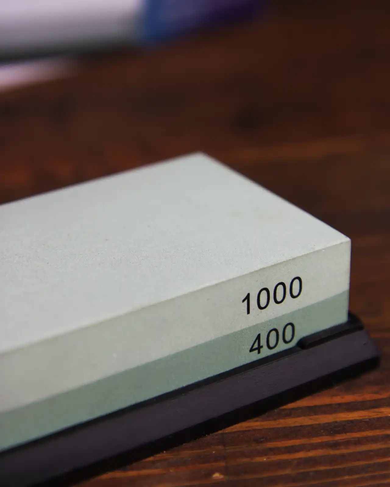 Strona o gradacji 400 służy do właściwego ostrzenia — usuwania stępień, mikrouszkodzeń i formowania krawędzi tnącej. Strona o gradacji 1000 umożliwia osiągnięcie ostrości praktycznej na co dzień, a także do szybkiego podostrzania noży, które lekko straciły ostrość. Dzięki temu jeden kamień zastępuje dwa osobne — wystarczy go obrócić, by przejść od ostrzenia do wykańczania.